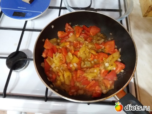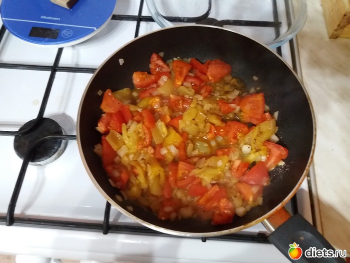 3. Лук обжарить на масле, добавить чищенный порезанный перец и помидоры, минут 5 потушить.