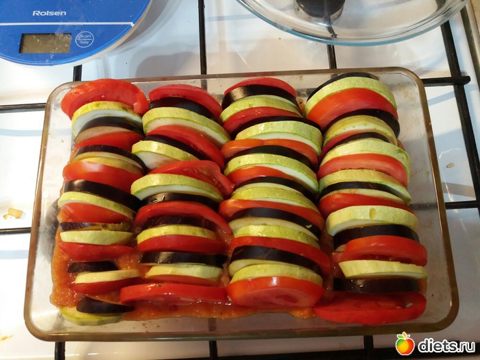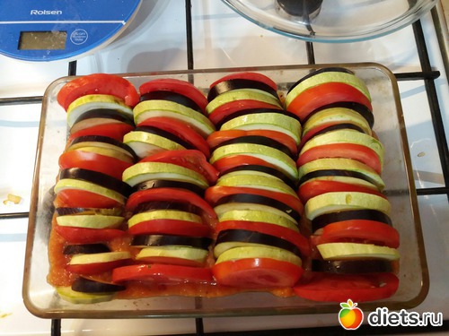 4. Этот соус выкладываем на дно формы. А дальше самое интересное: выкладываем по очереди кружки овощей. Красоиа - не мой конёк, я выложила как попало, но всё равно вышло неплохо!