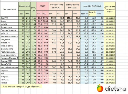 Diets.ru Таблица веса участников группы за 25.07.2017
