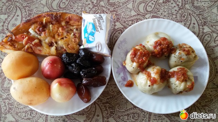 Пельмени с аджикой. Кусочек пиццы (половинку от кусочка скушала только). Конфета. Финики и чернослив. Абрикосы и нектаринки. Каркаде.
