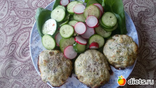 Рыбные котлеты запеченные в духовке. Огурцы, редиска, шпинат. Зеленый чай.