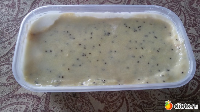 Должно было быть двухслойное желе. Нижний слой творог, верхний слой смешанное киви и запеченное яблоко. Но в верхний слой мало положила желатина. Поэтому нижний слой получился, а фруктовый нет, но вкусно, хоть на вид и не очень.