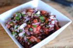 Красную луковицу мелко нарезаем и добавляем к помидорам и фасоли.