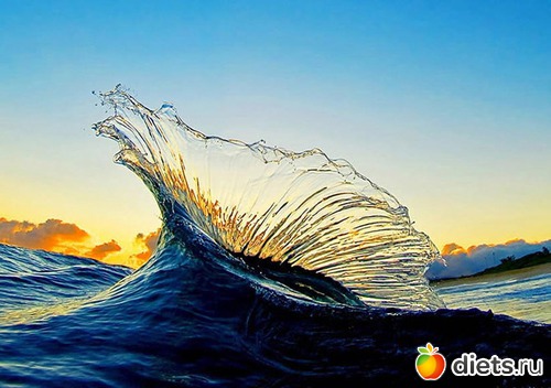 «Утренняя фотография волны на восходе солнца, которая столкнулась со следующей за ней волной, отчего в воздухе получилась невообразимо красивая арка, похожая на рыбу парусник».