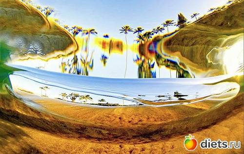 «Если внимательно посмотреть на волну вверху справа, можно увидеть береговую линию и отражающееся в ней «перевернутое» солнце, что похоже на то, как в изогнутой ложке отражаются предметы в перевернутом состоянии».