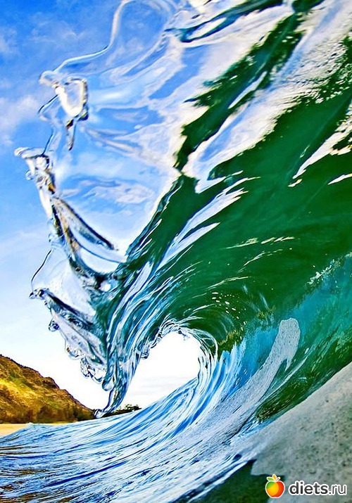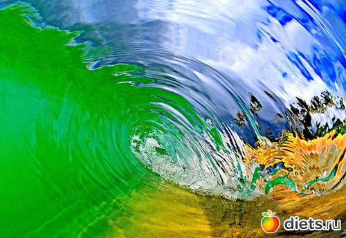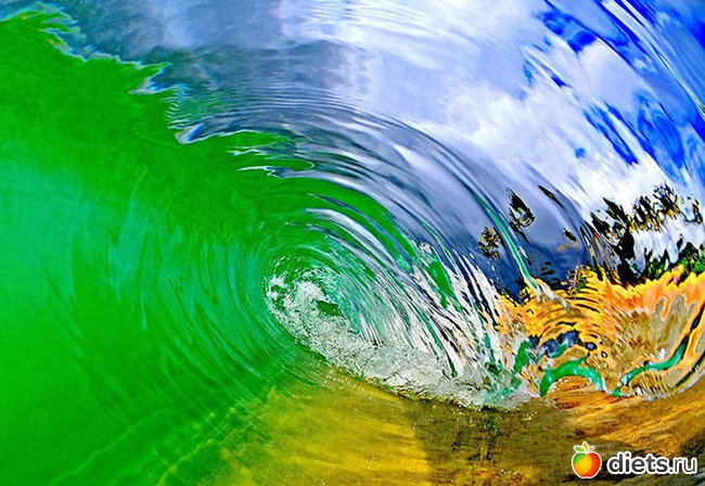 В фотографиях Кларка те, кто никогда не был серфером, могут пережить то, что испытывают они, когда оказываются в волне и видят эти удивительные цвета света и воды. «Стеклянная волна. Часть оттенка справа на воде получилась от камеры моей дочери, которая стоит с ней на другой стороне».