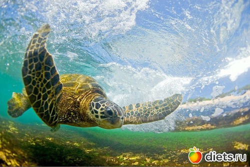 «Морские черепахи подплывают близко к берегу, так как питаются на коралловых рифах на отмели. Они очень сосредоточены и всегда следят за разбивающимися волнами».