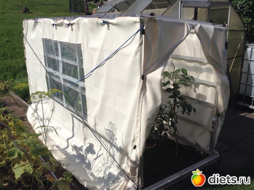 У меня акрила нет, вернее можно купить, но он тонкий и рвётся быстро! Так я палаточные стены купила и с четырёх сторон накрыла! А потолок шифером из пластика прозрачного(дешёвые были)! Вроде как и грядка, но и вроде как теплица! Так в этой палатке помидоры крепкие и созрели быстрее чем в теплице!