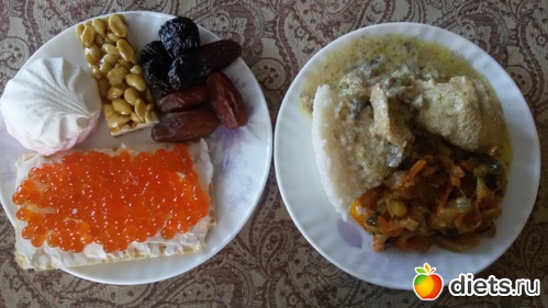 Рис с курицей в сливочно-грибном соусе. Тушенный кабачок. Хлебец с творожным сыром и икрой. Козинак. Зефир. Чернослив и финики. Кофе с молоком.