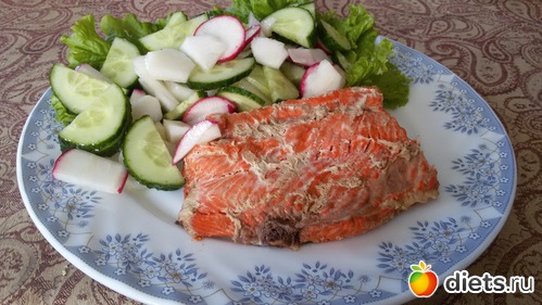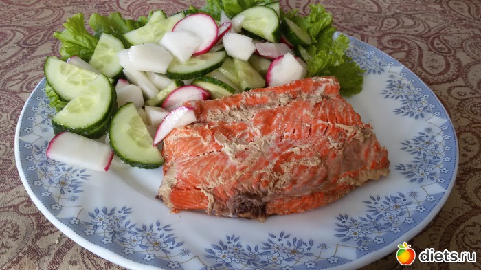 Запеченная рыба. Салат (зелень, огурцы, редиска, репа, масло). Зеленый чай.