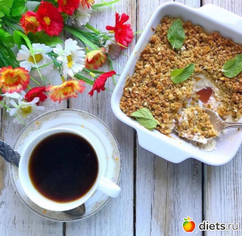 В смазанную форму для запекания выкладываем творожно-фруктовую массу и засыпаем овсяно-ореховой смесью. Отправляем в духовку минут на 30 при 180 градусах (но ориентируйтесь по своей духовке) Как только верхний слой станет золотистым можно доставать.