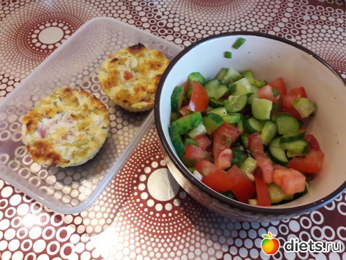Ужин - творожные кексы с овощами и сыром + салат из огурца и помидора, заправленный лимонным соком