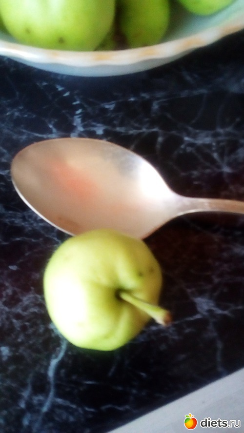 Вот яблоки-летний сорт,которые в это время уже заканчивались-сейчас еще не созрели.Я сфоткала-в сравнении со столовой ложкой.Вообщем-все для лилипутов!Даче 30 лет,ни одного года такого не было!Груши-как-будто -в июне,даже не растут.А обычно в августе-уже осы их все выедали,медовый сорт.