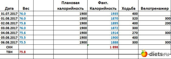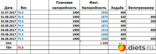 Девочки всем доброе утро понедельника! С началом новой недельки и пусть она будет удачной и погода не подводит. Ну вот пришло время смотреть на результат недели. Вес сегодня 75.4, 600 гр ушло или слилось, ну не важно, а вообще подумываю, что надо еще отслеживать и такой показатель, как жиры, надо понаблюдать за этим.
