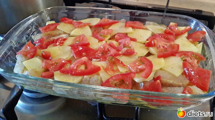 Положила все слоями в прозрачную прямоугольную форму для выпечки: лук - картофель - рыба - картофель - томаты