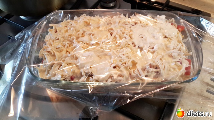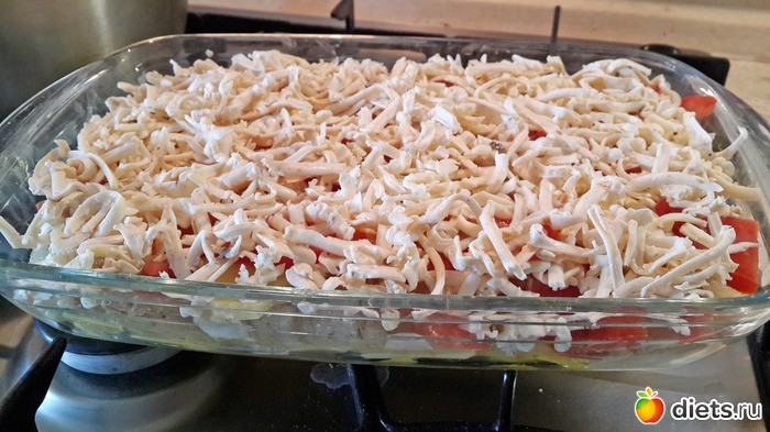 Затем - тертый сыр и заливка.