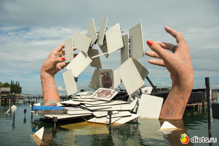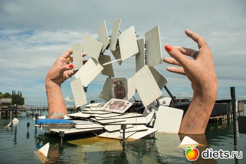 На следующий день заезд в Австрию - город Брегенц. Одна из достопримечательностей - огромная сцена, построенная прямо в озере, зрители сидят на берегу на трибунах на 6300 мест, и любуются представлением прямо на воде - сейчас дают оперу "Кармен", и декорации выглядят так -