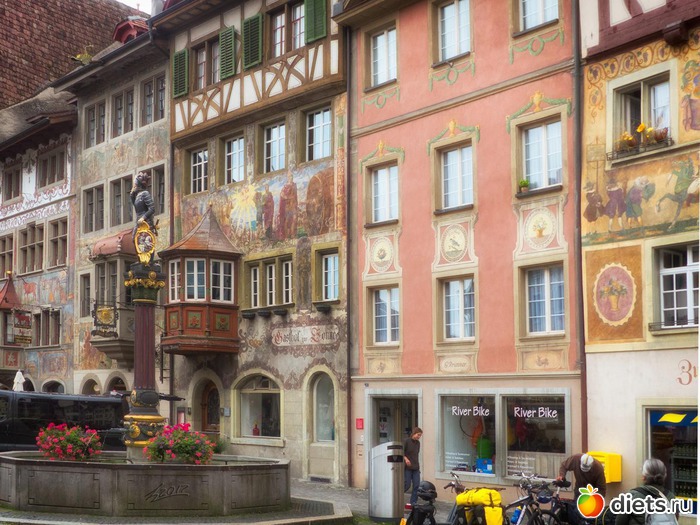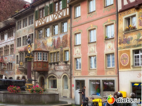 Жаль, времени было немного, а то бы еще поднялась (или спустилась?) по лестнице к самой воде. Но кто везет - тот и командует. Автобус поехал дальше, в городок Штайн-ам-Райн со множеством очень ярко расписанных домов, прямо от фундамента до крыши -