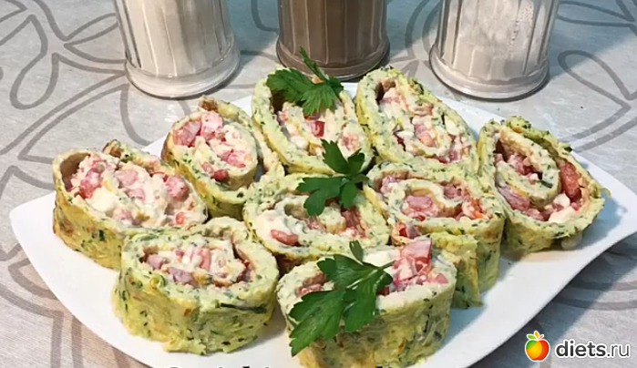 Кабачки трем на терке, отжимаем лишнюю жидкость. Вбиваем яйца, муку, соль и хорошо вымешиваем. Выкладываем на противень, застеленный пергаментной бумагой, и выпекаем наш корж в духовке примерно 20-30 минут при 200 градусах.