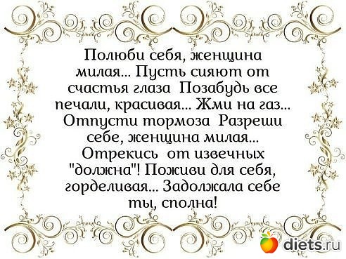 Вообще нам, девочкам, всем достается — и полным, и худым. Видимо, так сложилось исторически. Ведь самое главное для девочки, чтоб она... была красивой, удачно вышла замуж, родила детей и положила свою жизнь на их воспитание и заботу о муже. О какой любви к себе может идти речь?! Эгоистка! Но это уже другая тема для разговора.