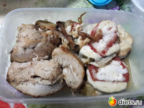 Ужин - запеченная курица + запеченные кабачки с помидором и сыром