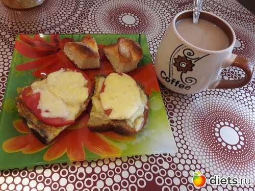 Завтрак - гренки с помидором и сыром, творожный манник, кофе с молоком