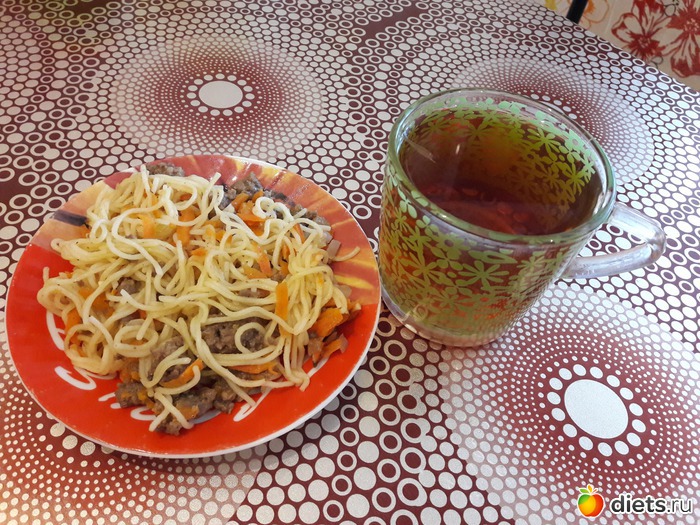 Завтрак - макароны + мороженое с ореховой и шоколадной крошкой, чай