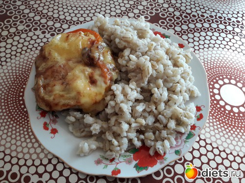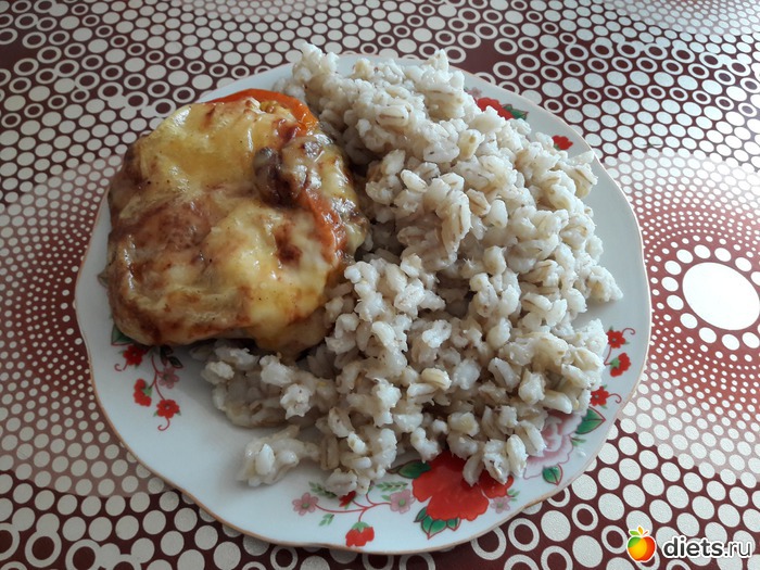 Обед - говяжья котлета под помидором и сыром (запеченная в духовке) + перловка