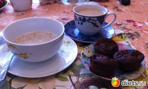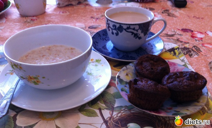 На завтрак была каша, 3 ПП-кекса, и чай с молоком. Рецепт кексов здесь: https://www.diets.ru/post/1757006/