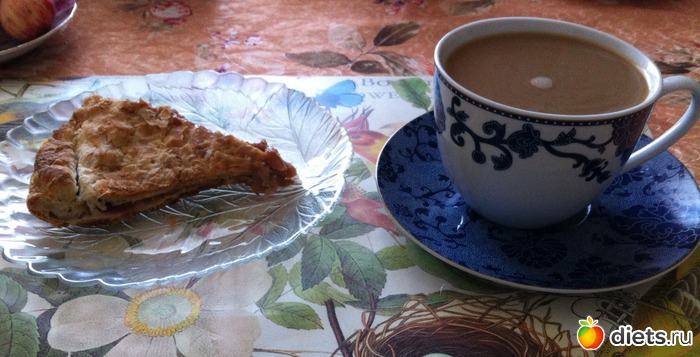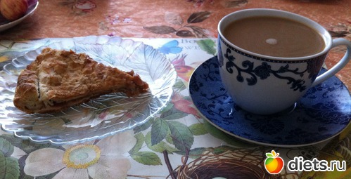 Завтрак: пирог фруктовый и кофе с молоком.