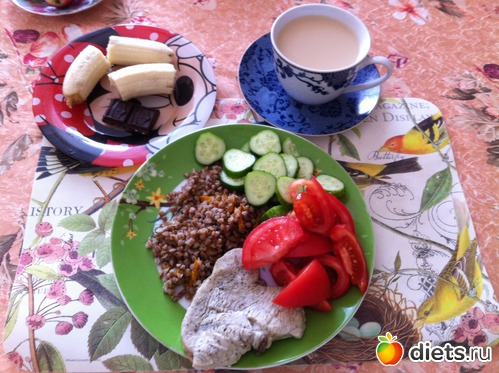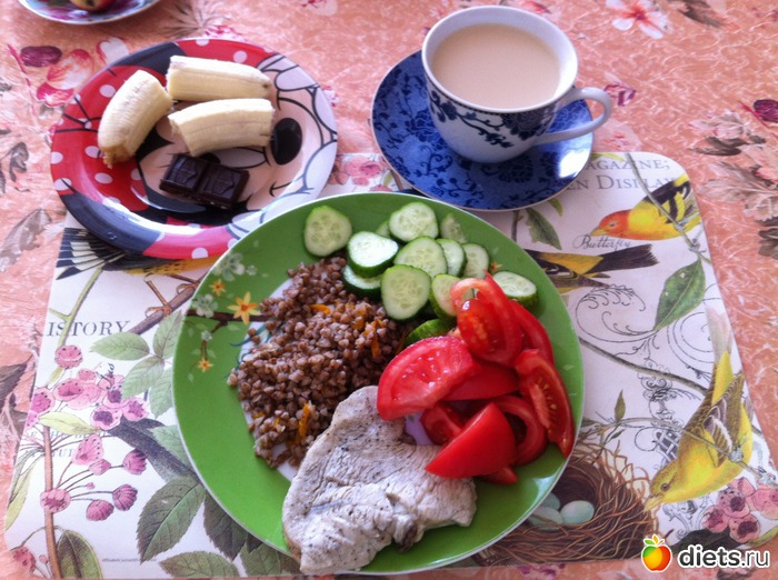 Обед: индейка на пару, овощи, греча отварная, травяной чай с молоком, банан и шоколад на десерт.