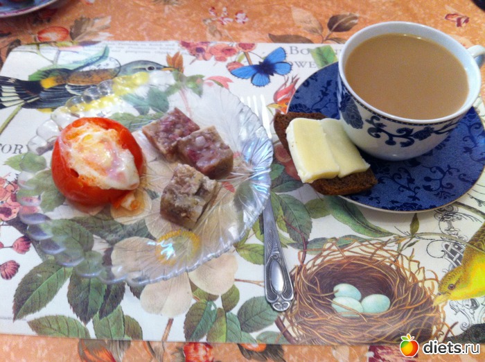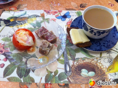 Полдник: яйцо с помидором, студень, бородинский хлеб с сыром и цикорий с молоком.