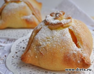 На середину квадрата из теста выложить яблоки, внутрь которых засыпать сахар, смешанный с корицей.