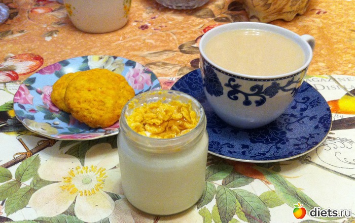Завтрак: морковное печенье, домашний йогурт + кукурузные хлопья и мед, чай с молоком.