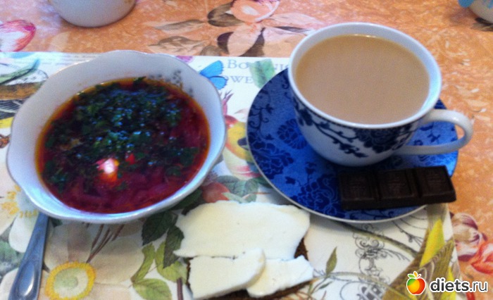 Обед: борщ со сметаной и зеленью, бутерброд с адыгейским сыром, кофе с корицей и молоком, шоколад темный «Бабаевский»