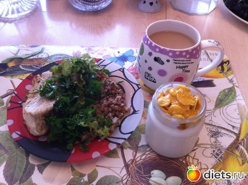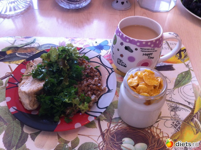 Полдник: индейка, греча, зелень, йогурт домашний + хлопья кукурузные и мед, чай с молоком.