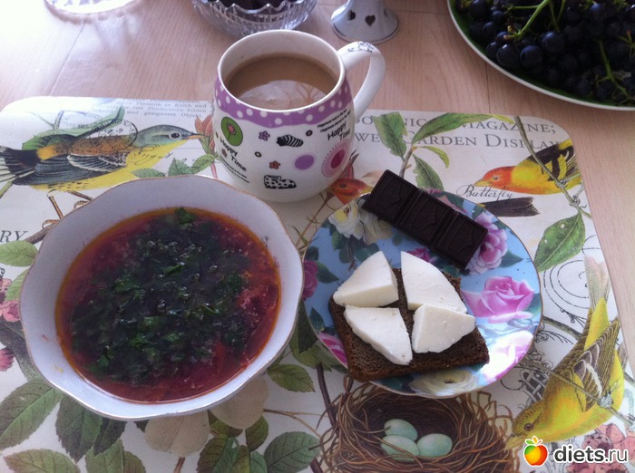 Обед: борщ со сметаной и зеленью, бутерброд с адыгейским сыром темный шоколад "Бабаевский" с черносливом (первый раз такой ела, прикольная вещь), кофе с молоком.