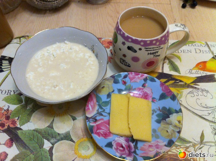 Ужин: творог 5% + ряженка, сыр "Эдам", 2 кружки чая с молоком.