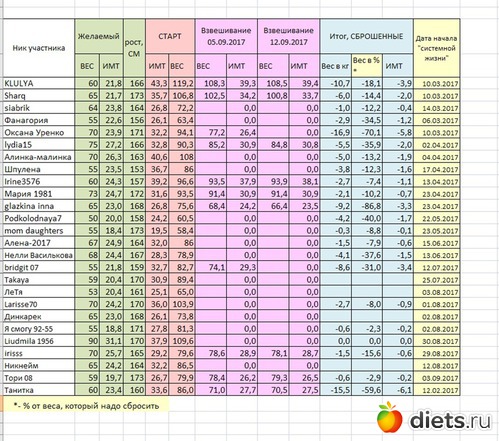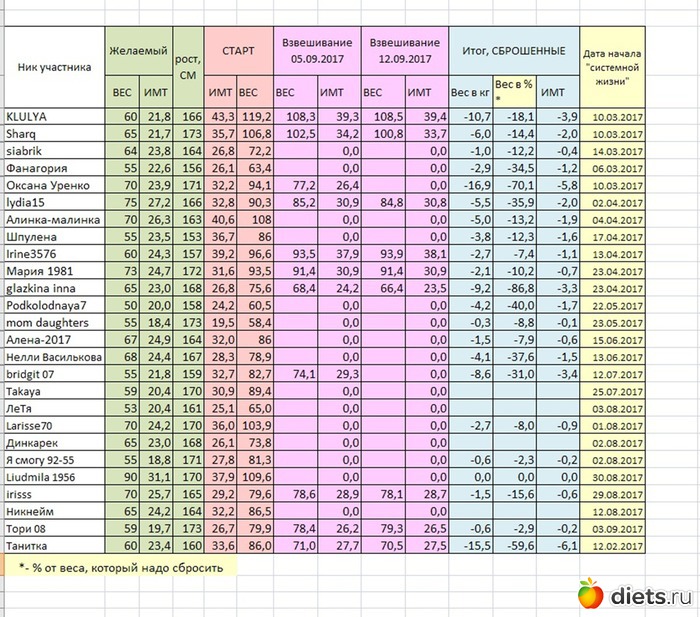Diets.ru Таблица веса участников группы за 12.09.2017