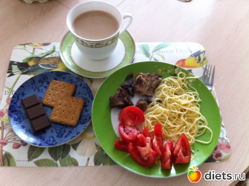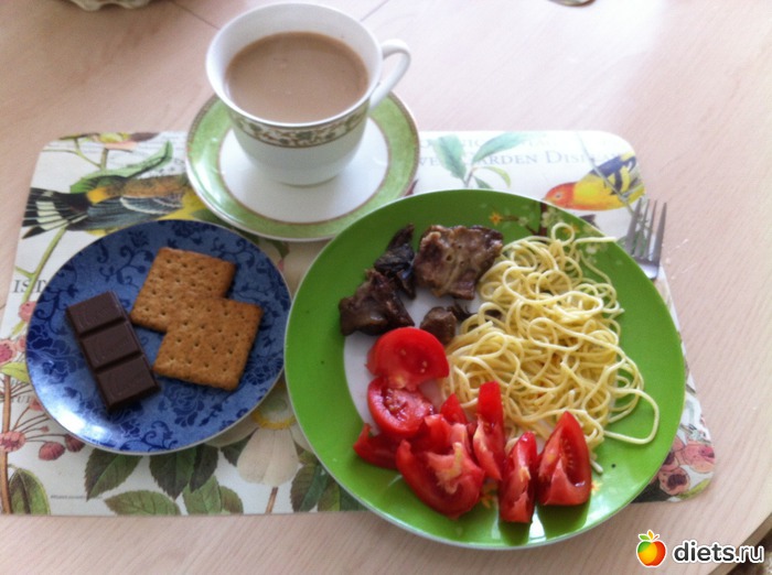 Обед: макароны, говядина отварная, крекер, шоколад, кофе с молоком.
