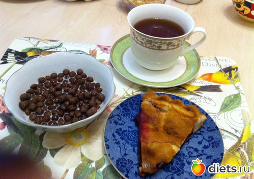 Завтрак: пирог фруктовый, шарики шоколадные с молоком, чай.
