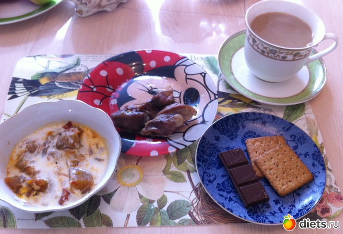 Обед: овощное рагу + домашний йогурт, индейка на пару, крекер, шоколад, кофе с молоком.