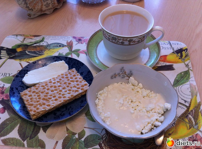 Полдник: творог 5% + йогурт домашний, сыр адыгейский, 2 вафельных хлебца с 1 ч.л. меда, чай с молоком.