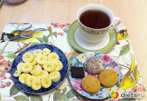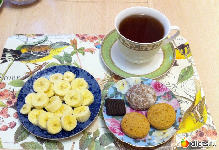 Завтрак: банан, пряник, 2 овсяных печенья, гематоген, чай.