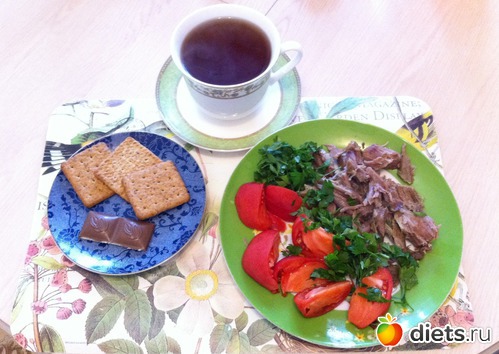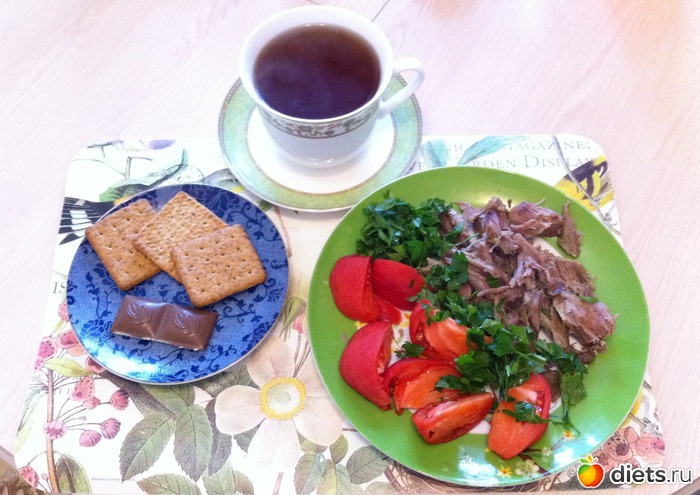 Обед: индейка, помидор, крекер, шоколад, чай.