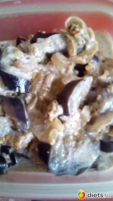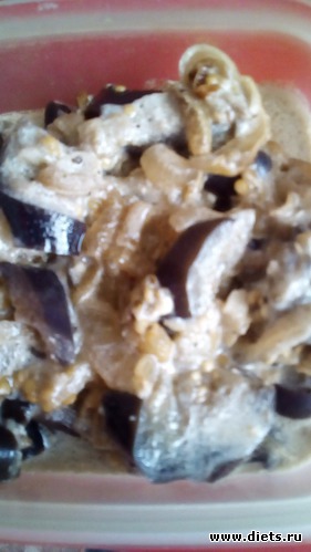 Порезать лук полукольцами, довести его до мягкости на сковороде. Положить туда порезанные баклажаны. Посолить, поперчить. Добавить все любимые специи, которые Вы запланировали.