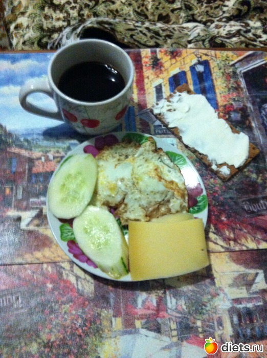 кофе с 1 ч. лож.сахара, яичница, на фото 2 яйца, но съедено было одно, огурчик и гречневый хлебец с творожным сыром. И мой любимый пармезан, ну не могу я без сыра, я маньяк.