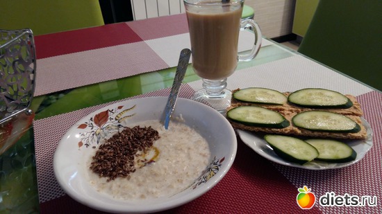 З. каша овсяная с клюквой и яблоком (которую в прошлом отчете показывала) +льняное семя+ кофе с молоком без сахара( с сахаром не пью ни чай, ни кофе)+2 хлебца с паштетом из индейки и огурчик