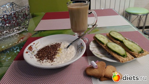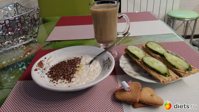 З. каша рисовая+ льняное семя+ два хлебца с паштетом из индейки и огурчиком+кофе с молоком и печеньки, которые вчера показывала