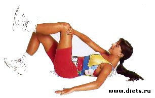 Вариант предыдущего упражнения: перекиньте левую ногу через правую. Левую руку положите в сторону, голову приподнимите, правой рукой сильно нажмите на левое бедро и сосчитайте до пяти. Проделайте 5-10 раз для каждой стороны меняя положение ног.